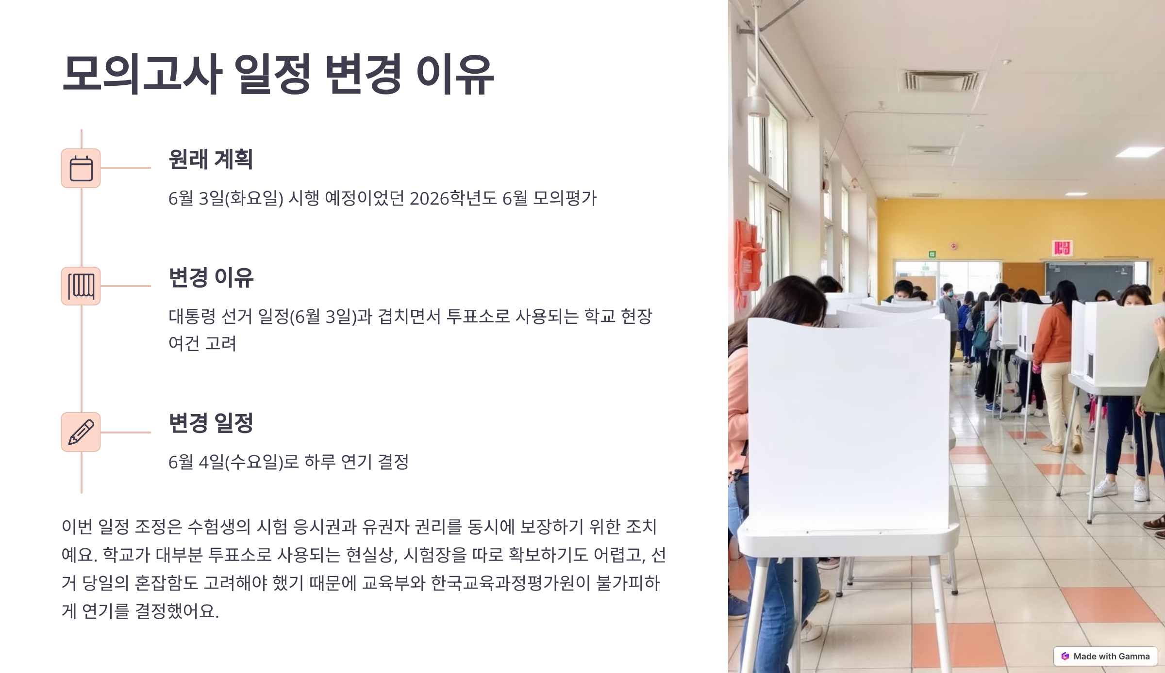 모평 일정이 조정된 건 2025년 6월 3일에 조기 대통령 선거가 치러지기로 결정되었기 때문이에요. 공휴일로 지정된 이 날은 전국의 많은 학교가 투표소로 활용돼요.