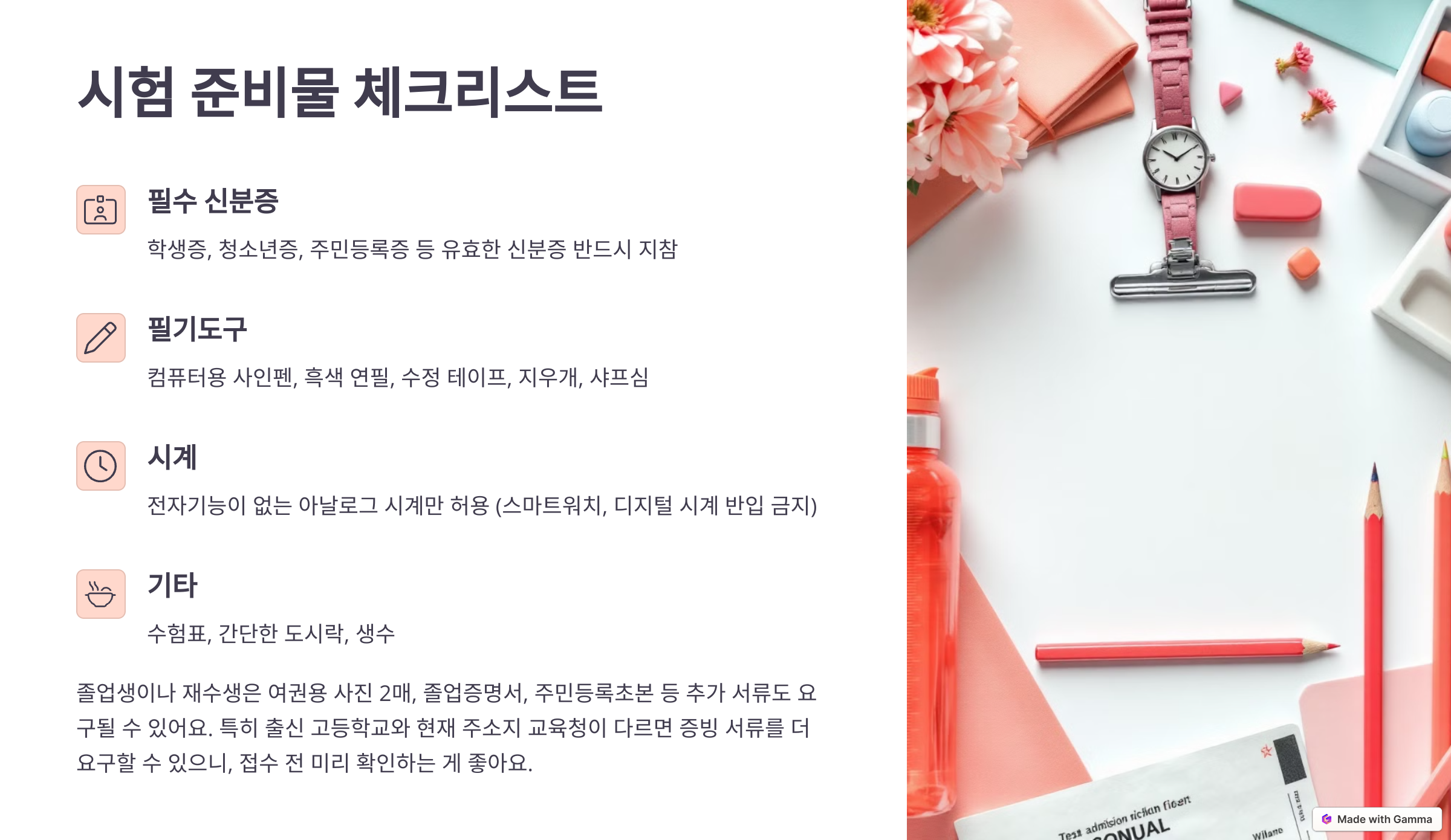 시험일 당일에는 8시 10분까지 입실 완료해야 하니까 늦지 않도록 주의해야 해요.